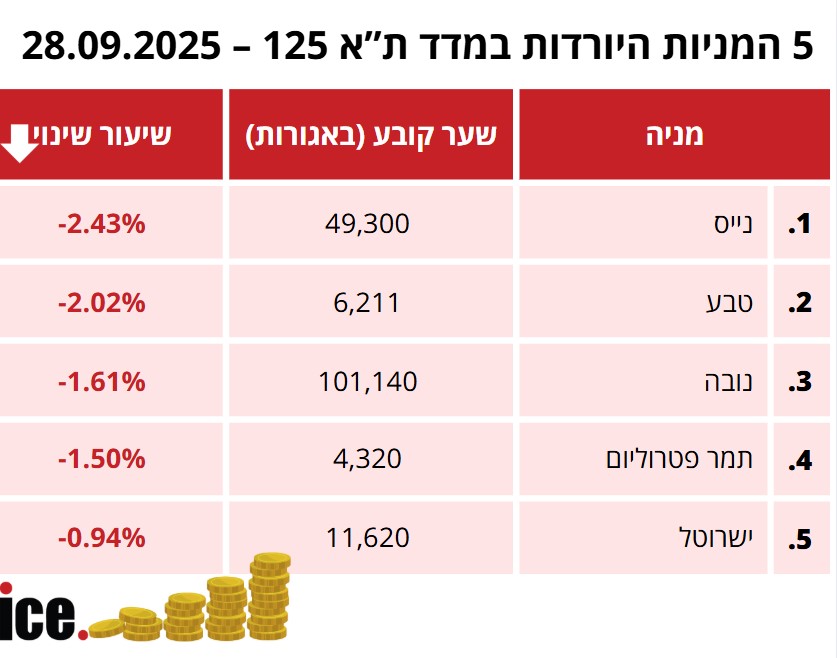 בקרב חמש המניות היורדות, המפסידה היא חברת נייס שמנייתה ירדה ב-2.43% לרמה של 49,300 אגורות. מניית טבע פחתה ב-2.02% לרמה של 6,211 אגורות. במקום השלישי, מופיעה חברה נוספת שהציגה שינוי שלילי - נובה. מניית החברה הישראלית ירדה ב-1.61% לרמה של 101,140 אגורות. אחריה, מופיעה חברת תמר פטרוליום שמנייתה הציגה ירידה של 1.50% לרמה של 4,320 אגורות. רשת ישרוטל רשמה ירידה של 0.94% לרמה של 11,620 אגורות.