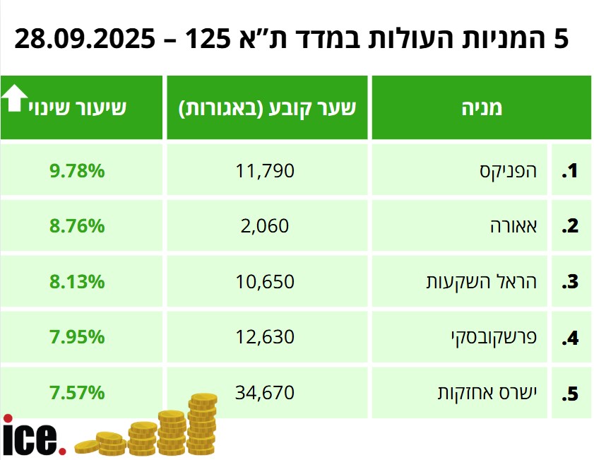 בקרב חמש המניות העולות, המנצחת היא חברת הפניקס שמנייתה עלתה ב-9.78% לרמה של 11,790 אגורות. חברת אאורה צמחה ב-8.76% לרמה שלך 2,060 אגורות. חברה נוספת שהציגה שינוי חיובי היא הראל השקעות שמנייתה גדלה ב-8.13% לרמה של 10,650 אגורות. חברת פרשקובסקי קפצה ב-7.95%, לרמה של 12,630 אגורות. ישרס אחזקות עלתה ב-7.57% לרמה של 34,670 אגורות.