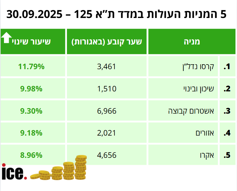 ברשימת העולות הבולטות: קרסו נדל"ן נסקה ב-11.79% לשער 3,461 אגורות, שיכון ובינוי קפצה ב-9.98% לשער 1,510 אגורות, אשטרום קבוצה זינקה ב-9.30% לשער 6,966 אגורות, אזורים צמחה ב-9.18% לשער 2,021 אגורות ואקרו עלתה ב-8.96% לשער 4,656 אגורות.
