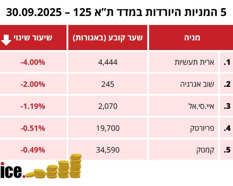 ברשימת היורדות הבולטות: ארית תעשיות התרסקה ב-4% לשער 4,444 אגורות, שוב אנרגיה הידרדה ב-2% לשער 245 אגורות, איי.סי.אל ירדה ב-1.19% לשער 2,070 אגורות, פריורטק ירדה ב-0.51% לשער 19,700 אגורות וקמטק ירדה ב-0.49% לשער 34,590 אגורות.