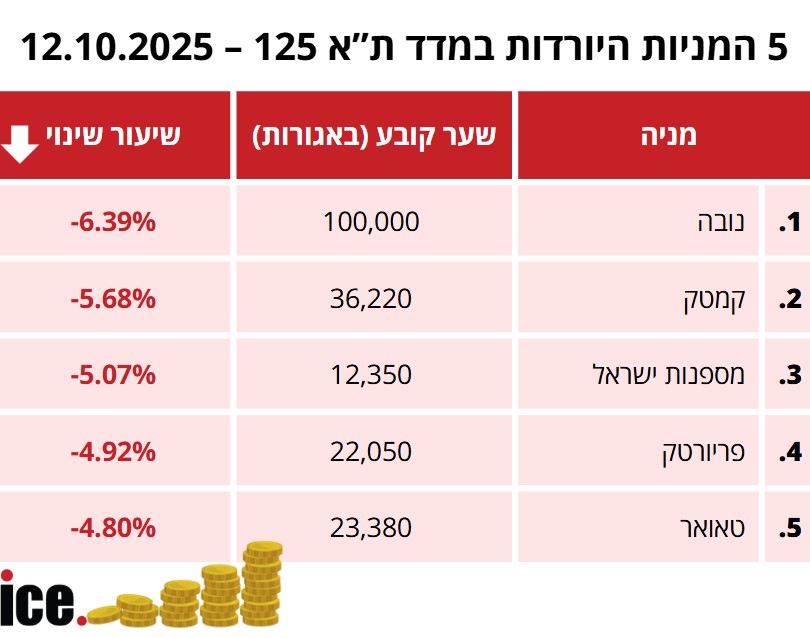 בקרב חמש המניות היורדות, המפסידה היא חברת נובה שירדה ב-6.39% לרמה של 100,000 אגורות. חברת קמטק שמנייתה צנחה ב-5.68% לרמה של 36,220 אגורות. מנייתה של חברת מספנות ישראל שמנייתה פחתה ב-5.07% לרמה של 12,350 אגורות. פריורטק הציגה שינוי שלילי בגזרת המניות וצללה ב-4.92% לרמה של 22,050 אגורות. חברת טאואר שמנייתה ירדה ב-4.80% לרמה של 23,380 אגורות.