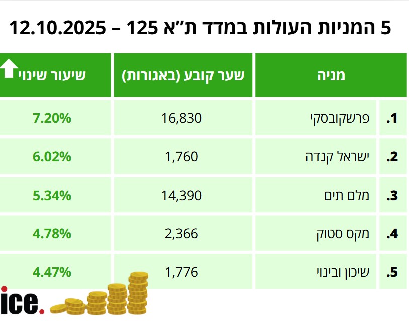 בקרב חמש המניות העולות, המנצחת היא חברת פרשקובסקי שמנייתה עלתה ב-7.20% לרמה של 16,830 אגורות. אחריה, ניצבת חברת ישראל קנדה שמנייתה גדלה ב-6.02% לרמה של 1,760 אגורות.