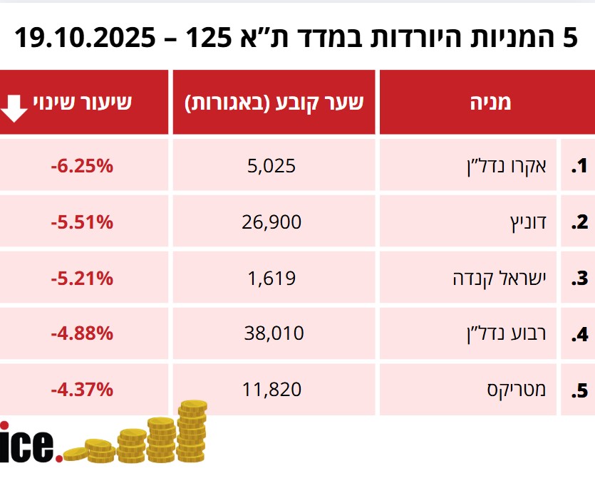 בקרב חמש המניות היורדות, המפסידה היא חברת אקרו נדל"ן, המתמחה בהקמת פרויקטים רחבי היקף באזורי ביקוש והשבחתם, שצללה ב-6.25% לרמה של 5,025 אגורות.