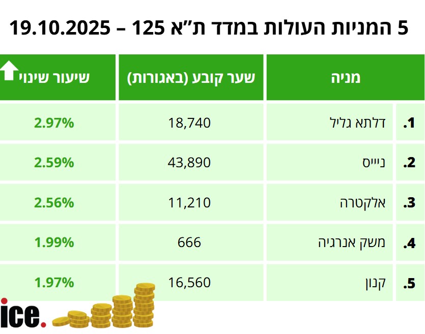 בקרב חמש המניות העולות, המנצחת היא חברת דלתא גליל תעשיות, המייצרת ומשווקת מוצרי הלבשה, אשר עלתה ב-2.97% לרמה של 18,740 אגורות. כזכור, בתחילת החודש החברה הישראלית דיווחה על רכישת מותג הלייף-סטייל האמריקאי Daily Drills. היקף העסקה הסתכם ב-65 מיליון דולר במזומן, עם פוטנציאל לתשלומי Earn-Out נוספים המותנים בעמידה ביעדי רווחיות לשנים 2026–2029.