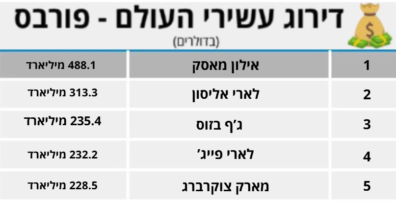 שבוע נוסף הגיעו לסיומו ועמו מתפרסם דירוג עשירי העולם של מגזין "פורבס". אילון מאסק, האיש העשיר ביותר בעולם, המשמש כבעלים של החברות טסלה ורשת X, רשם הפסד של 12.1 מיליארד דולר, מדובר בירידה של 2.42% בהונו הפרטי המוערך ב-488.1 מיליארד דולר.