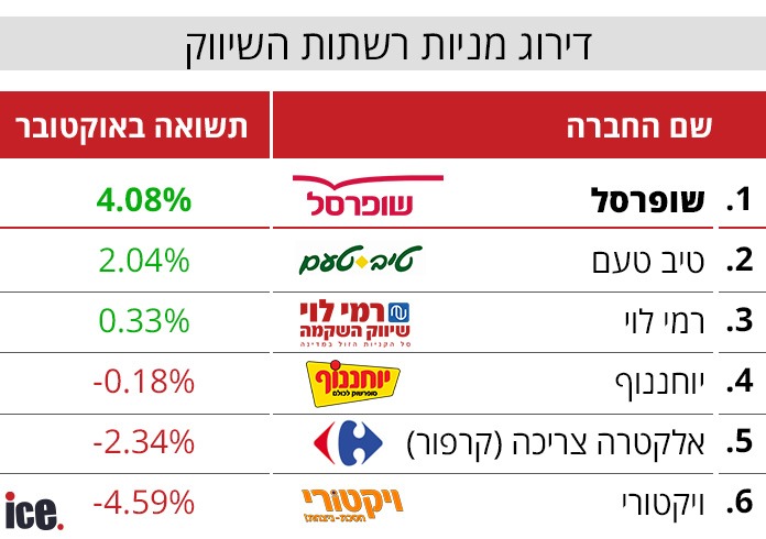 אחרי שופרסל, מי שבלטה באוקטובר הייתה טיב טעם עם עלייה של 2% ואחריה רמי לוי עם עלייה של 0.3%. שאר הרשתות הציגו ירידה - יוחננוף עם 0.2%, אלקטרה צריכה עם 2.3% וויקטורי בלטה במיוחד לשלילה עם ירידה של 4.6%.