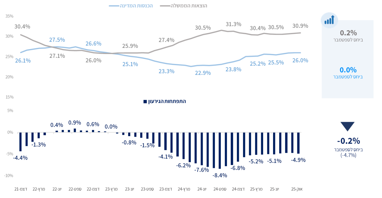לצד זאת, עדכון תחזית התוצר בסוף אוקטובר - ירידה של 41 מיליארד שקל לכ-2,106 מיליארד שקל - גרמה לעלייה חשבונאית בשיעורי הגירעון. כלומר, חלק מהעלייה נובעת גם מהצטמצמות הכלכלה ולא רק מהוצאות גבוהות.