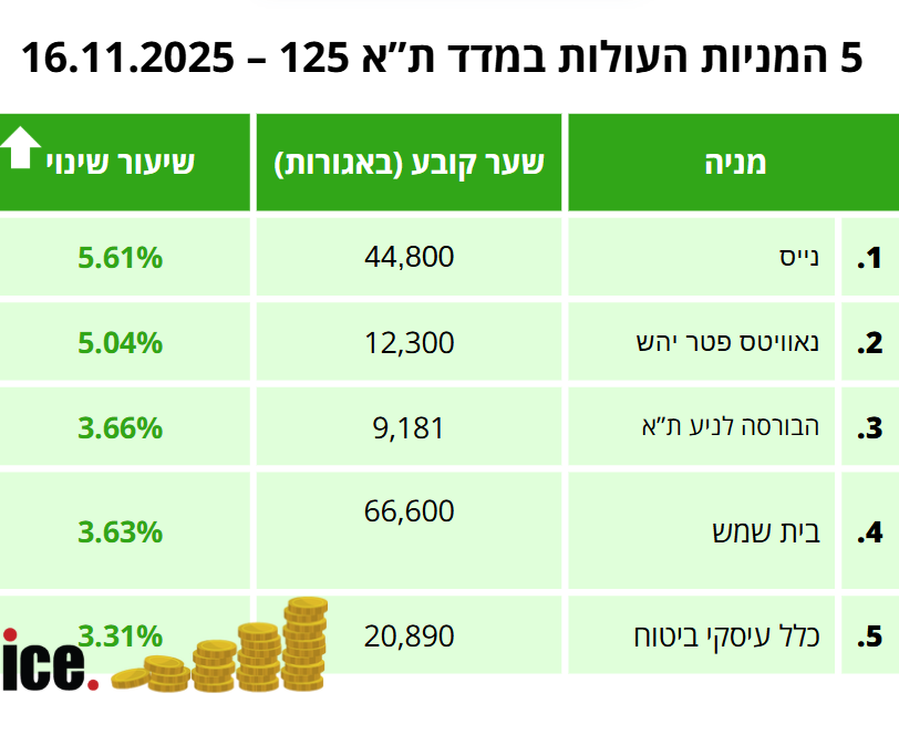 במסגרת 5 המניות העולות הבולטות במדד ת"א 125, מניית נייס ממשיכה במגמת העלייה שלה מיום חמישי ורושמת עלייה של 5.61% לרמה של 42,000 אגורות, והופכת להיות המנייה עם העלייה הכי חזקה בשוק היום.