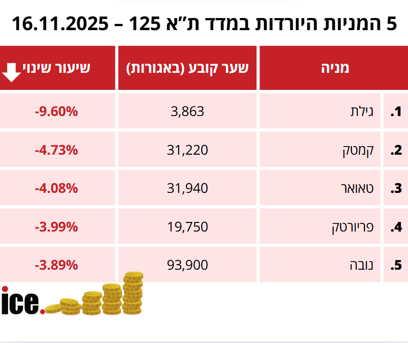 במסגרת 5 המניות היורדות מניית גילת חוותה את הירידה החדה ביותר ורשמה ירידה של -9.60%, לרמה של 3,863 אגורות. במקום השני נמצאת מניית קמטק עם ירידה של -4.73% לרמה של 31,220 אגורות.