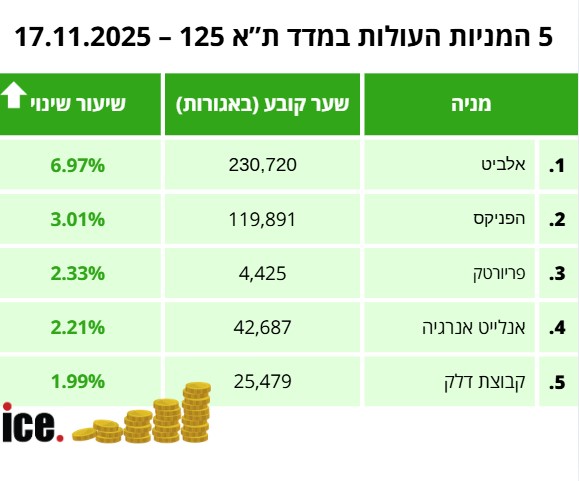מי שרושמת את העלייה הגדולה ביותר היא אלביט מערכות, שסגרה היום את אחת מהעסקאות הגדולות ביותר בתולדותיה ונסקה עם עלייה של 6.97% לרמה של 230,720 אגורות. אחריה מניית הפניקס, שטיפסה ב-3.01% לרמה של 119,891 אגורות.