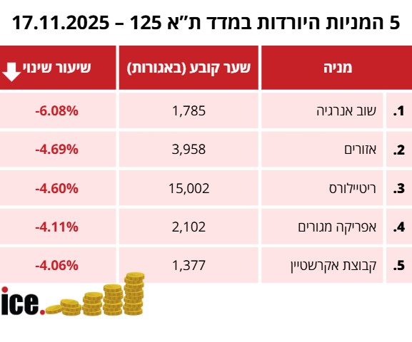 מנגד, מי שרושמת את הירידה החדה ביותר היום היא מניית שוב אנרגיה, שנצחה ב-6.08% לרמה של 1,785 אגורות. אחריה מניית אזורים, שצנחה ב-4.69% לרמה של 3,958 אגורות. מניית ריטיילורס שבבעלות איש העסקים הראל ויזל צנחה ב-4.60% לרמה של 15,002 אגורות.