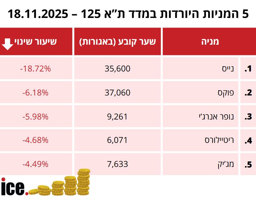 במסגרת 5 המניות היורדות הבולטות, במקום הראשון נמצאת מניית נייס שחווה התרסקות קשה ביותר כשירדה ב-18.72% לרמה של 35,600 אגורות, כנראה בעקבות הכנס האחרון למשקיעים שערכה החברה שגרם למשקיעים רבים לבצע תחזיות, שמצביעות על שחיקה ברווחיות של החברה בשנים הקרובות, המספרים שהוצגו מראים שמדובר בתקופה מאתגרת, מה שמסביר מדוע משקיעים שמחפשים הזדמנויות לא ממהרים להשקיע, וגורמים למנייה להתרסק בצורה שכזו.