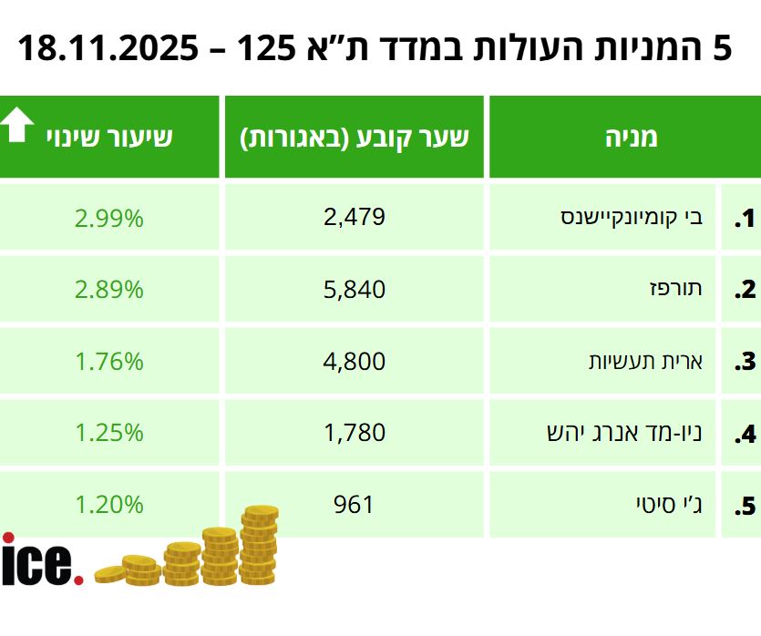 במסגרת 5 המניות העולות הבולטות ביותר, מניית בי קומיונקיישנס רשמה עליה של 2.99% לרמה של 2479 אגורות. במקום השני מניית תורפז שרשמה עלייה של 2.89 לרמה של 5,840 אגורות.