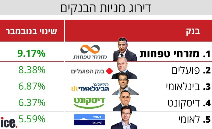 מדד הבנקים זינק בנובמבר ב-7%, מהתשואות הבולטות בקרב המדדים בבורסה. מבין המניות הובילה מזרחי טפחות שעלתה בכ-9.17%, זאת אחרי שהציגה רווח של 1.48 מיליארד שקל ברבעון עם תשואה להון של 17.6%, הגבוהה במערכת לצד זו של פועלים.