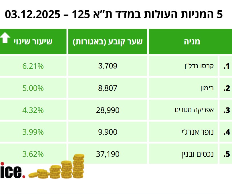 במסגרת 5 המניות העולות הבולטות: במקום הראשון נמצאת מניית משק אנרגיה שזינקה אתמול בכ-10% רשמה היום עם שינוי של 6.55% לרמה של 690 אגורות. במקום השני נמצאת מניית הבורסה לניע בתא שרושמת עלייה של 3.60% לרמה של 9,407 אגורות.