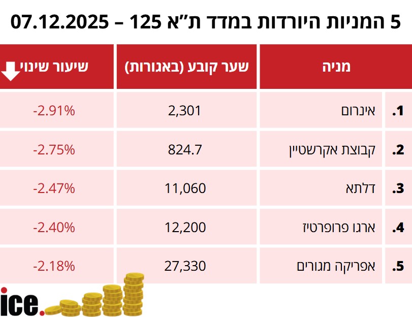 בקרב חמש המניות היורדות, המפסידה היא חברת אינרום שמנייתה פחתה ב-2.91% לרמה של 2,301 אגורות. קבוצת אקרשטיין מופיעה במקום השני עם ירידה של 2.75% במניה ו-824.7 אגורות. אחריה, ניצבת חברת דלתא שמנייתה הציגה שינוי שלילי וירדה ב-2.47% לרמה של 11,060 אגורות. חברת ארגו פרופרטיז איבדה 2.40% מערך המניה לרמה של 12,200 אגורות. חברת אפריקה מגורים פחתה ב-2.18% לרמה של 27,330 אגורות.