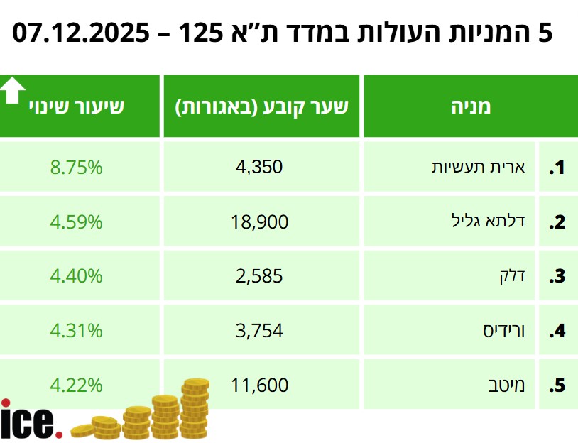 חברת דלתא גליל עלתה ב-4.59% לרמה של 18,900 אגורות. אחריה, ניצבת חברת דלק שמנייתה עלתה ב-4.40% לרמה של 2,585 אגורות. חברת ורידיס הציגה שינוי חיובי בגזרת המניות וירדה ב-4.31% לרמה של 3,754 אגורות. בית ההשקעות מיטב גדלה ב-4.22% לרמה של 11,600 אגורות.