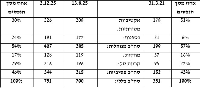 מאז ה-31 במרץ 2021, דהיינו במשך כארבע שנים וחצי התעשייה יותר מאשר הכפילה את נכסיה מ-351 מיליארד שקל לכ-750 מיליארד שקל: 114%. כיום, מאז מאי 2024, תוך שנה וחצי, התעשייה גדלה ב-50%, מ-500 מיליארד שקל לכ-750 מיליארד שקל כיום.