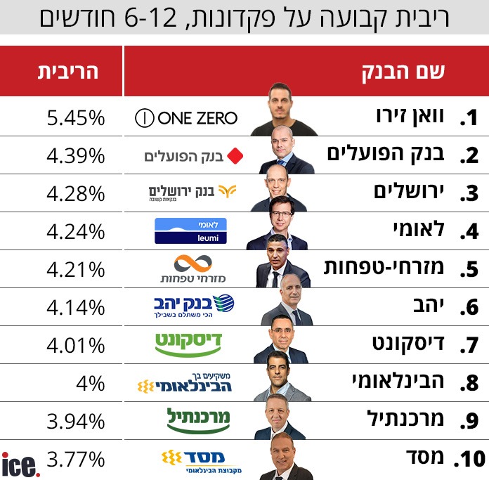 כפי שאפשר ללמוד מהטבלה, בנק וואן זירו, שנדחק בחודש שעבר מהמקום הראשון, זר אליו. הריבית על הפיקדונות גבוהה מאוד, בטח אחרי הורדת ריבית, ועומדת על 5.45%. בנק פועלים, ירושלים, הלאומי ומזרחי מעניקים ריבית גבוהה מהממוצע.