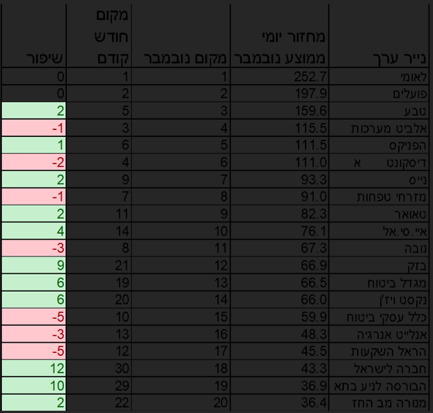 ברשימת המניות הנסחרות ביותר לחודש נובמבר בבורסת תל אביב, נרשמו כמה הפתעות ושינויים בולטים: