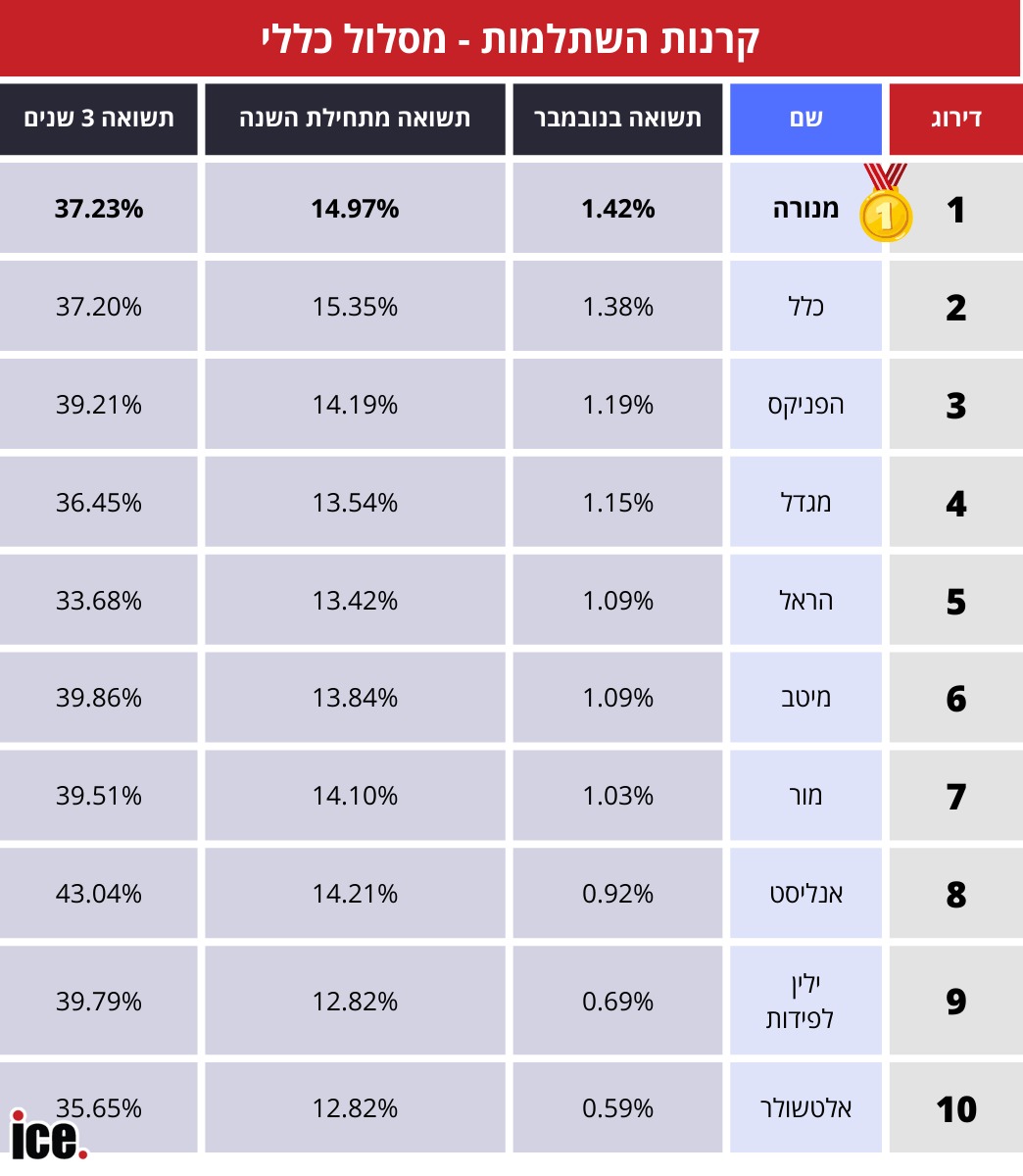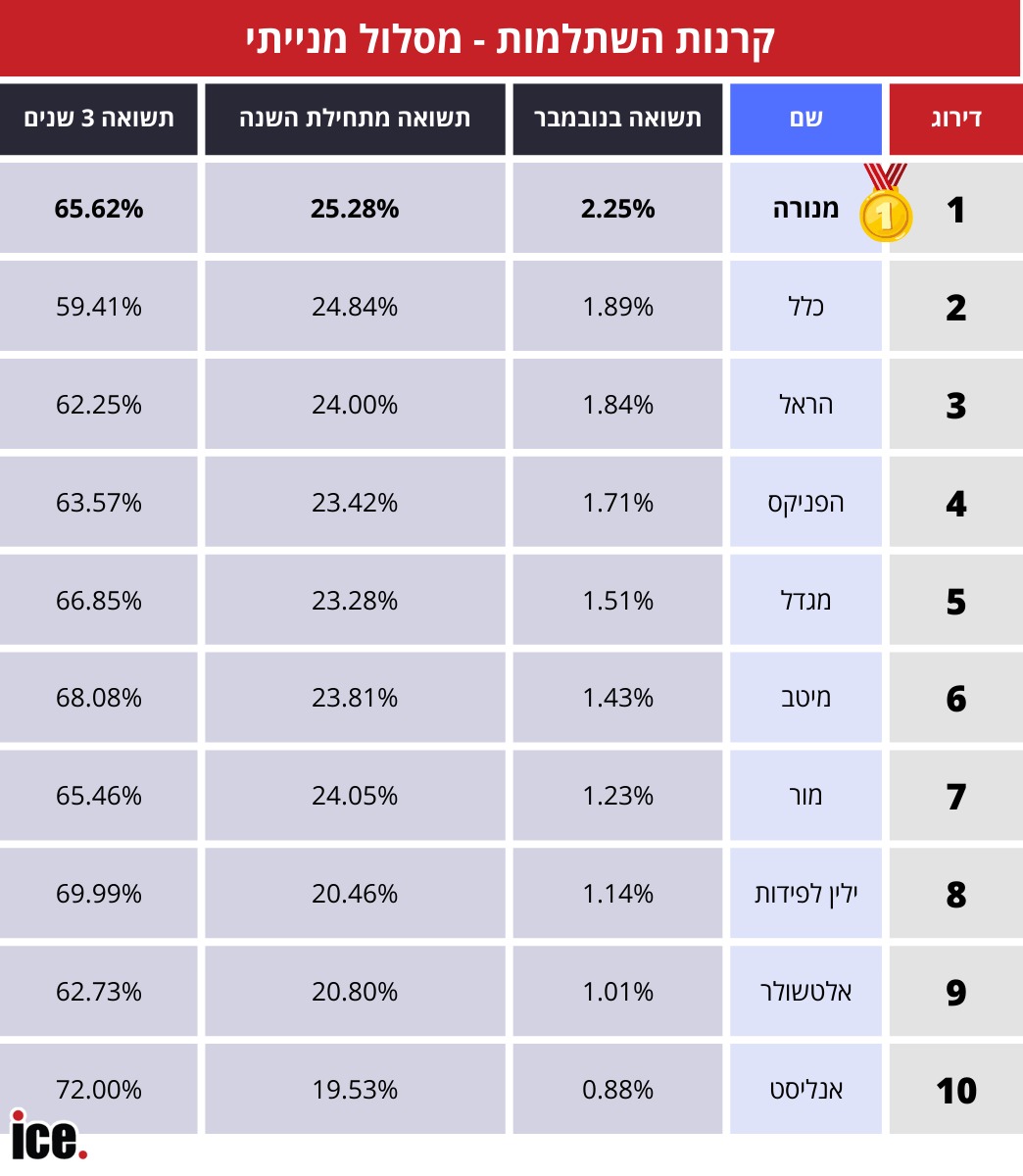 השונות הזו נובעת בעיקר בתמהיל הקרן, אם כי המסלול הכללי די דומה בין הגופים. לכן מעניין לראות את הפערים הגדולים - 0.83% בין מנורה שבמקום הראשון בנובמבר עם 1.42% לבין אלטשולר, שחזרה לתחתית, עם 0.59%.
