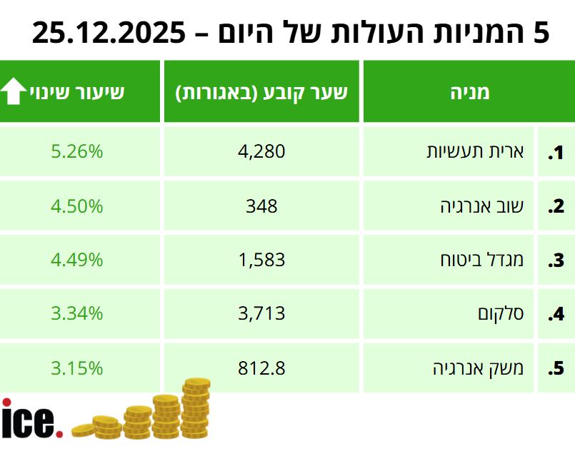 במסגרת 5 המניות העולות הבולטות: במקום הראשון נמצאת מניית ארית תעשיות שמזנקת ב-5.26% לרמה של 4,280 אגורות.