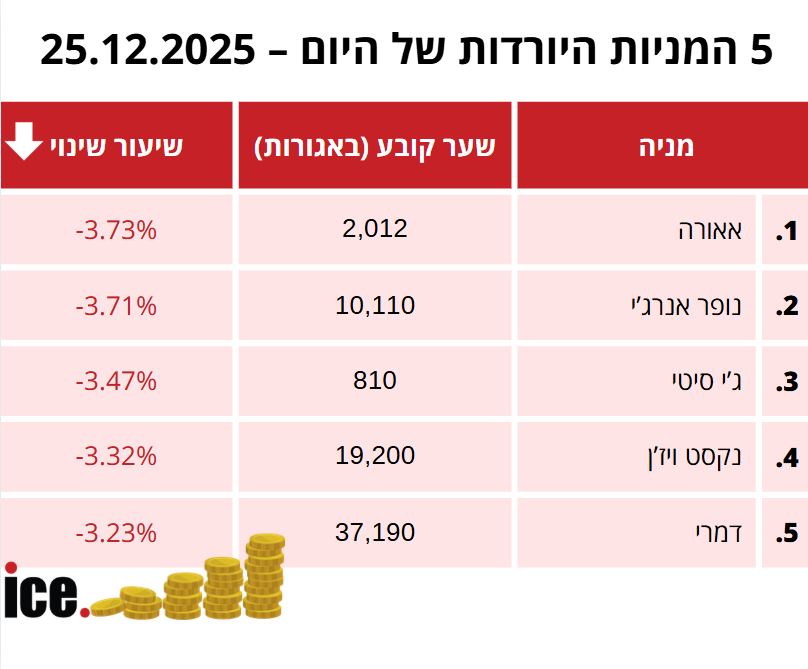 במסגרת 5 המניות היורדות הבולטות: במקום הראשון נמצאת מניית אאורה עם ירידה של -3.73% לרמה של 2,012 אגורות. במקום השני נמצאת מניית נופר אנרג'י עם ירידה כמעט זהה של -3.71% לרמה של 10,110 אגורות.
