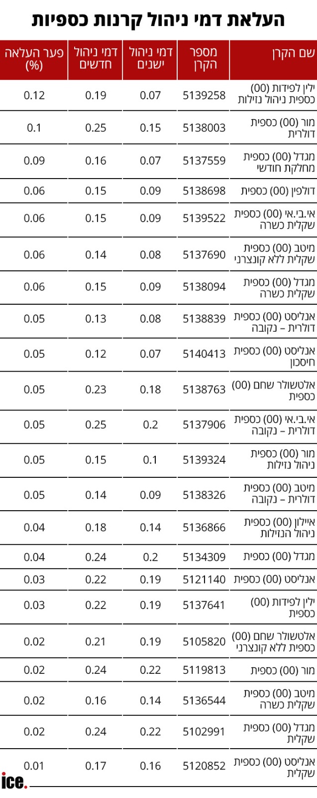 גם "אלטשולר שחם כספית" ו"אי.בי.אי כספית דולרית - נקובה" מצטרפות למועדון ההעלאות הגבוהות, כשכל אחת מהן מעלה את דמי הניהול ב-0.05% נוספים.