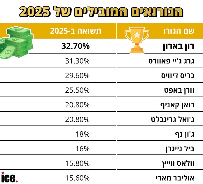 רון בארון, שמנהל כיום נכסים בהיקף של כ-41 מיליארד דולר, הוביל השנה את רשימת הגורואים עם תשואה יוצאת דופן. הקרן הבולטת שבניהולו מציגה מאז הקמתה תשואה מצטברת של מעל 1,800% - תוצאה שממחישה את כוחו של השקעה ארוכת טווח משולבת בבחירות נכונות.