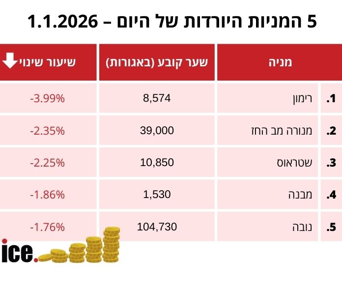 במסגרת 5 המניות היורדות הבולטות: במקום הראשון נמצאת מניית רימון עם ירידה של 3.99% לרמה של 8,574 אגורות. במקום השני נמצאת מניית מנורה מב החז שרושמת ירידה של 2.35% לרמה של 39,000 אגורות.
