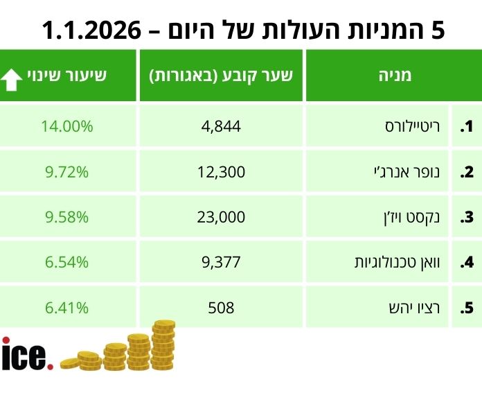 במסגרת 5 המניות העולות הבולטות: במקום הראשון מניית ריטיילורס, שעשתה זינוק מרשים של 14.00% לרמה של 4,844 אגורות.