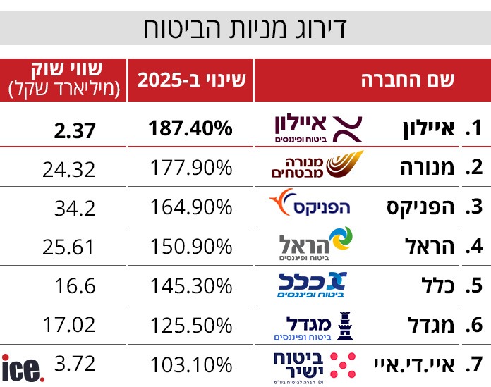 בראש הטבלה הובילה איילון עם זינוק של 187%, אחריה מנורה בזינוק של כמעט 178%, ומיד אחריה הפניקס עם 165%. הראל וכלל עלו בכ-151% ו-145% בהתאמה, בעוד מגדל סגרה את השנה עם עלייה מכובדת של 125%. גם חברת הביטוח איי.די.איי. זינקה ב-103%.