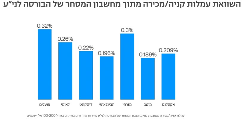 בבנק מציינים כי מבדיקה במחשבון המסחר של הבורסה לניירות ערך עולה כי מדובר בעמלה הנמוכה ביותר כיום הן בקרב הבנקים והן בקרב בתי ההשקעות. לשם השוואה, העמלות הממוצעות לפעולה בתיקים בהיקף של 100–200 אלף שקלים עומדות על כ־0.13% בבית ההשקעות פסגות, עם עמלת מינימום של 6 דולרים לאחר הטבות, וכ־0.189% במיטב טרייד, עם עמלת מינימום של 5 דולרים. בבנקים, העמלות הממוצעות מגיעות לכ־0.25%–0.3%, עם עמלות מינימום של כ־20 דולרים או כ־40 שקלים לפעולה.