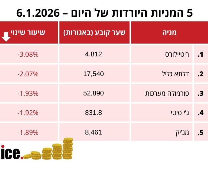 במסגרת 5 המניות היורדות הבולטות: במקום הראשון נמצאת מניית ריטיילורס עם ירידה של 3.08% לרמה של 4,812 אגורות. במקום השני נמצאת מניית דלתא גליל שרושמת ירידה של 2.07% לרמה של 17,540 אגורות.