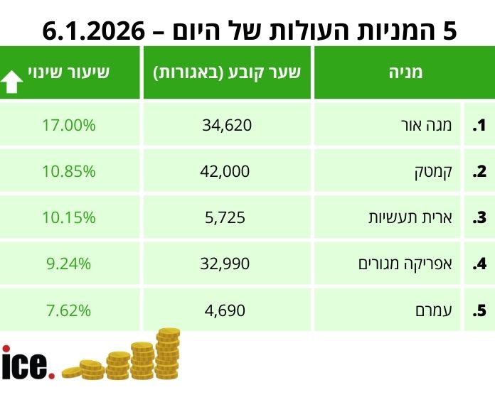 במסגרת 5 המניות העולות הבולטות נרשמו עליות חזקות במיוחד: במקום הראשון מניית מגה אור, שעשתה מהפך אדיר לאחר שאתמול ירדה בכמעט 5%, והיום עשתה זינוק שמסעיר את המשקיעים, של 17.00% שהביא אותה לרמה של 34,620 אגורות. במקום השני נמצאת מניית קמטק שמזנקת שוב עם עלייה של 10.85% לרמה של 42,000 אגורות, לאחר שאתמול זינקה המניה בכמעט 12%.