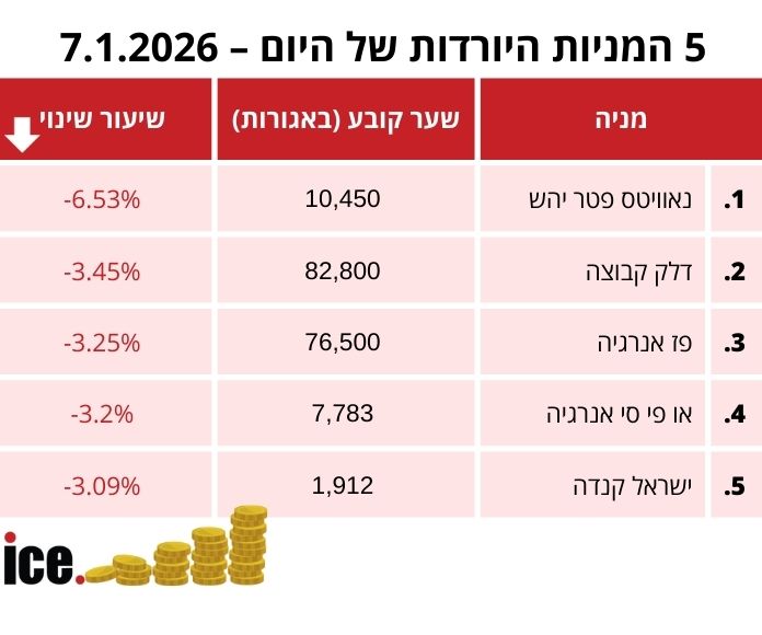 במסגרת 5 המניות היורדות הבולטות: מספר רב של מניות אנרגיה רשמו ירידה היום בעקבות עסקת הנפט בונצואלה עליה טראמפ הכריז, שעתיד להציף את השוק. במקום הראשון במסגרת המניות היורדות נמצאת מניית נאוויטס פטר יהש עם ירידה של 6.53% לרמה של 10,450 אגורות. במקום השני נמצאת מניית דלק קבוצה שרושמת ירידה של 3.45% לרמה של אגורות.
