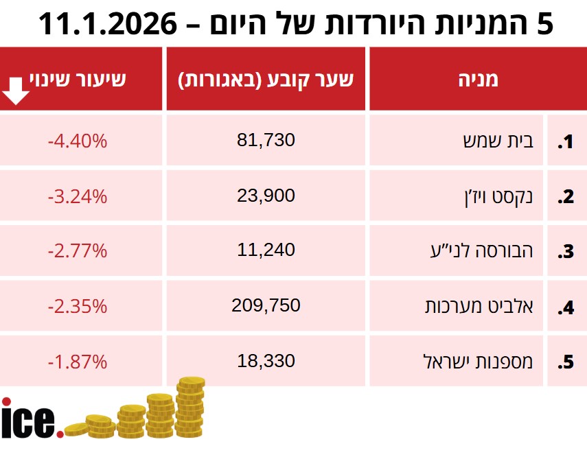 בקרב חמש המניות היורדות, המפסידה היא חברת בית שמש שמנייתה צנחה ב-4.40% לרמה של 81,730 אגורות. חברת נקסט ויז'ן הציגה שינוי שלילי ומנייתה ירדה ב-3.24% לרמה של 23,900 אגורות.