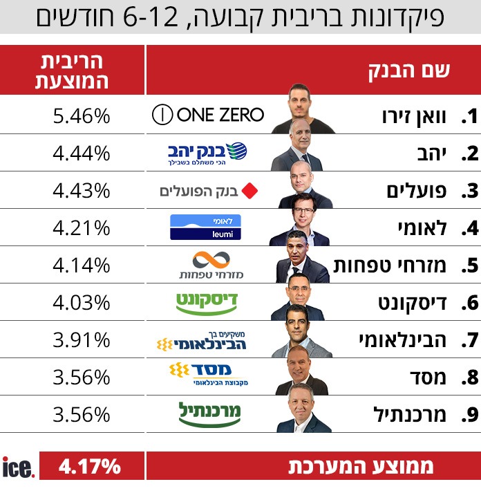 כפי שאפשר ללמוד מהטבלה, בנק וואן זירו נותן את הריבית הגבוהה ביותר, ולא רק זה: בניגוד למגמה לפני מספר חודשים, עליה שמר בעקביות כשהעניק ריבית של 5%, הריבית על הפיקדונות עלתה למרות הפחתת ריבית נוספת וצפי להפחתות נוספות. מהמשוואה נעלם בנק ירושלים, משום שהפיקדונות שהוא מעניק לטווח של 6-12 חודשים מהווה נתח של פחות מ-5% מכלל הפיקדונות של הבנק. הבנק המרכזי מתעלם, מסורתית, מנתונים כאלה.
