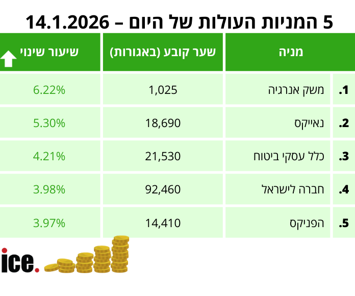 בקרב חמש המניות העולות, המנצחת היא חברת משק אנרגיה שמנייתה עלתה ב-6.22% לרמה של 1,025 אגורות. חברת נאייקס אחריה רושמת הישג כאשר המנייה שלה צומחת ב-5.30% לרמה של 18,690 אגורות.