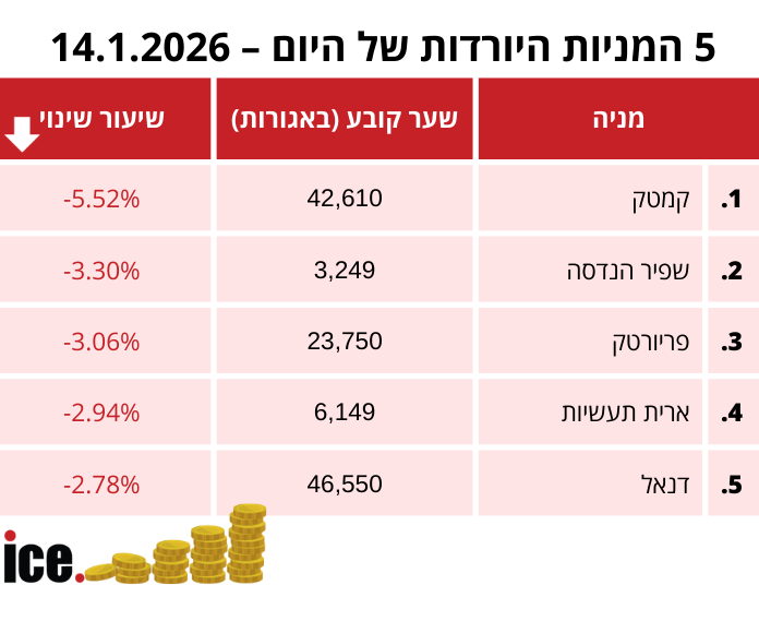 בקרב חמש המניות היורדות, המפסידה היא חברת קמטק שהמנייה שלה צנחה ב-5.52% לרמה של 42,610 אגורות. קבוצת שפיר הנדסה הציגה גם היא נפילה כאשר מנייתה ירדה ב-3.30% לרמה של 3,249 אגורות.