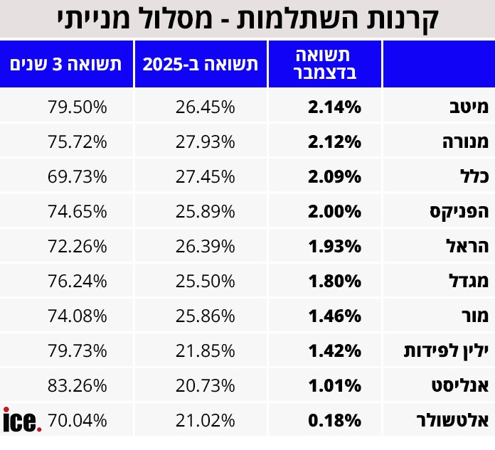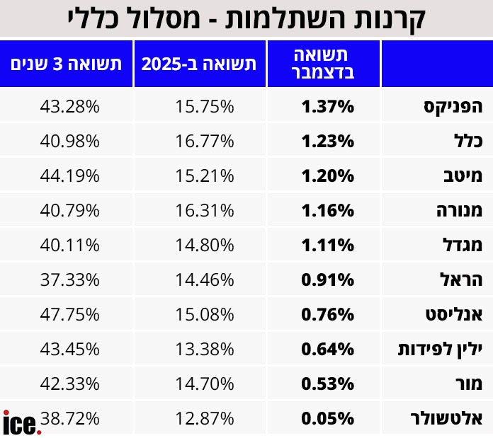 אבל לא כולם חגגו. בתחתית הדירוג נמצאת אלטשולר שחם עם תשואה אפסית של 0.18% בלבד בדצמבר במסלול המנייתי - פער עצום של כ-2% לעומת המובילות. גם במסלול הכללי, שמאוזן יותר בין מניות לאג"ח, התמונה דומה: הפניקס הובילה עם 1.37%, כלל עם 1.23% ומיטב עם 1.20%, בעוד אלטשולר שחם סיימה עם 0.05% בלבד.