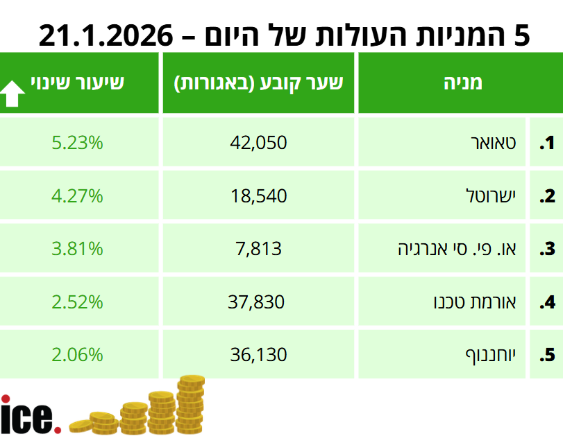 בקרב חמש המניות העולות, המנצחת היא חברת טאואר שמנייתה עלתה ב-5.23% לרמה של 42,050 אגורות. במקום השני, מופיעה רשת ישרוטל שקפצה ב-4.27% לרמה של 18,540 אגורות.