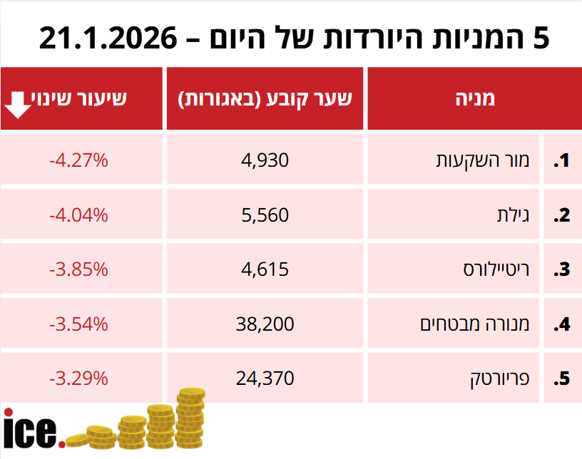 בקרב חמש המניות היורדות, המפסידה היא חברת מור השקעות שמנייתה ירדה ב-4.27% לרמה של 4,930 אגורות. במקום השני ניצבת חברת גילת צנחה ב-4.04% לרמה של 5,560 אגורות.