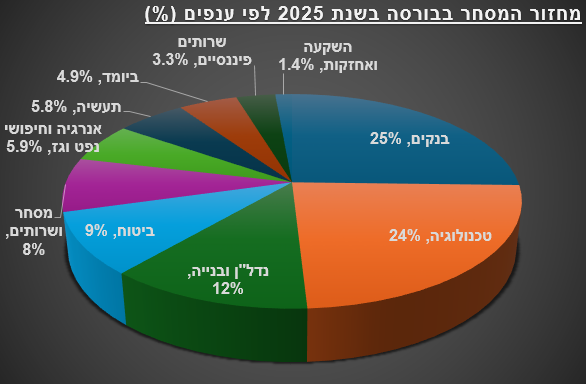 סקטור הפיננסים היה ללא ספק הכוכב של שנת 2025, כשהוא מרכז כ-38% מסך כל מחזור המסחר בבורסה - שיא כל הזמנים. מניות הבנקים ריכזו עניין רב ורשמו מחזור מסחר ממוצע של כ-640 מיליון שקל ביום, המהווה מעל רבע מסך המחזור בכל המניות. הזינוק במניות הבנקים (כ-60% במחזור הממוצע) הגיע על רקע רווחיות גבוהה, סביבת ריבית גבוהה וחלוקת דיבידנדים גבוהים לאחר הקלה במגבלות בנק ישראל.