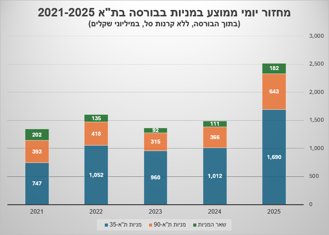 הנתון המרכזי המצביע על עוצמת המגמה הוא מחזור המסחר היומי הממוצע במניות בבורסה, שהסתכם בשנת 2025 בכ-2.5 מיליארד שקל ביום - זינוק של כ-69% לעומת המחזור בשנת 2024. אם בוחנים את המחזור הכולל בשוק המניות, הכולל גם קרנות סל ועסקאות מחוץ לבורסה, התמונה מרשימה אף היא: מחזור יומי ממוצע של כ-3.45 מיליארד שקל - עלייה של כ-57% לעומת השנה הקודמת.