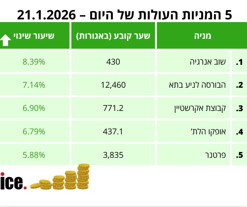 במסגרת 5 המניות העולות הבולטות: במקום הראשון ניצבת מניית שוב אנרגיה עם זינוק של 8.39% לרמה של 430 אגורות. במקום השני מניית הבורסה לניע בתא עם עלייה של 7.14% לרמה של 12,460 אגורות.