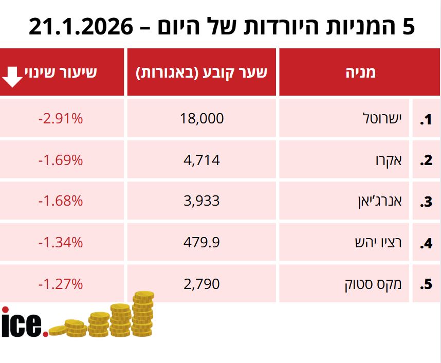 במסגרת 5 המניות היורדות הבולטות: במקום הראשון ניצבת מניית ישרוטל עם ירידה של 2.91%- לרמה של 18,000 אגורות. במקום השני ניצבת מניית אקרו עם עלייה של 1.69%- לרמה של 4,714 אגורות.