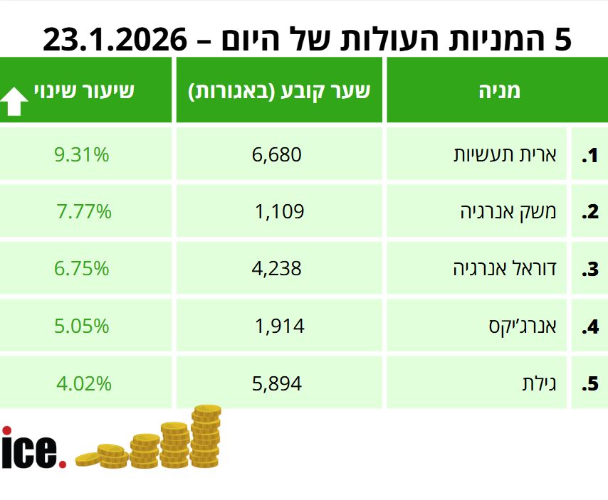 אנרג'יקס עולה ב-5.05% לשער 1,914 אגורות וגילת עם תשואה יומית מרשימה של 4.02%, מטפסת לשער 5,894 אגורות ונועלת את רשימת 5 המנצחות.