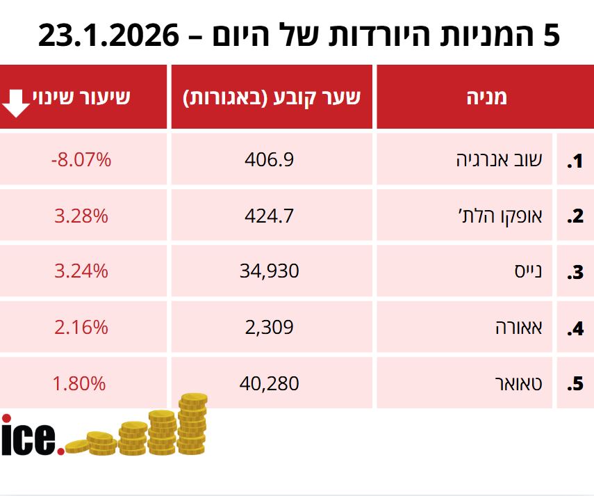 ברשימת המניות היורדות: שוב אנרגיה צונחת ב-8.07% לשער 406.9 אגורות, אופקו הלת' מדרדרת ב-3.28% לשער 424.7 אגורות, נייס יורדת ב-3.24% לשער 34,930 אגורות. אאורה יורדת ב-2.16% לשער 2,309 אגורות. טאואר יורדת ב-1.80% לשער 40,280 אגורות.