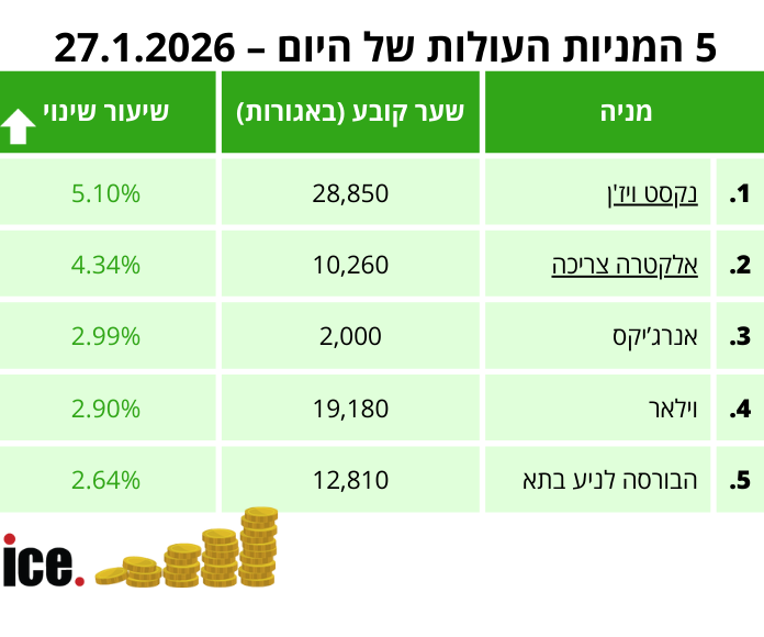 במסגרת 5 המניות העולות הבולטות: במקום הראשון נמצאת מניית נקסט ויז'ן עם עלייה משמעותית סיכום המסחר של 5.10% לרמה של 28,850 אגורות. במקום השני אלקטרה צריכה עם עלייה של 4.34% לרמה של 10,260 אגורות.